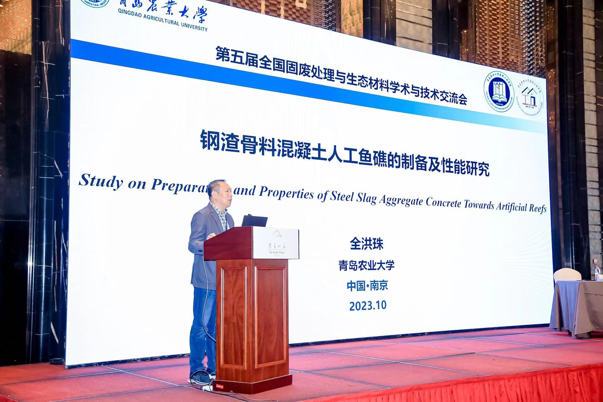 全洪珠教授在本次会议中做了分会场报告,报告题目为《钢渣骨料混凝土人工鱼礁的制备及性能研究》,系统介绍了工业固废钢渣骨料在海洋人工鱼礁领域的关键技术及实际应用,该研究成果也成功荣获2023年山东省海洋科技创新奖,为加强工业固废资源化利用和保护海洋生态环境提供了一条有效途径。同时,全洪珠教授受邀担任本次建筑固废分会场主持人,负责介绍各位报告专家简介,引导参会专家们探讨和交流学术问题,并为专家们颁发报告证书。