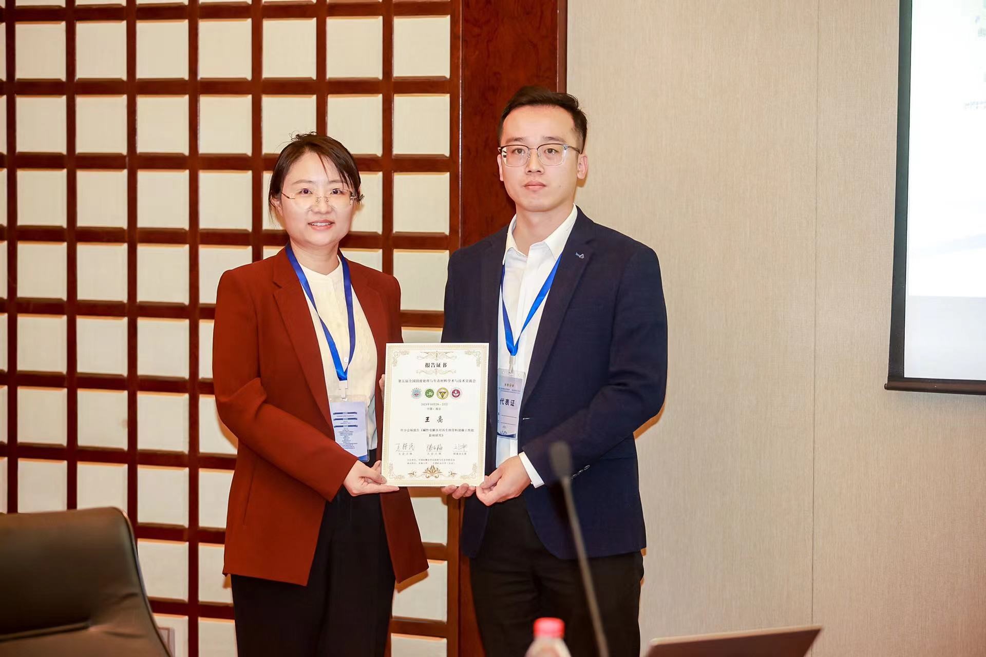 王亮副教授在本次会议中做了分会场报告,报告题目为《不同碱性电解水对再生细骨料混凝土性能的影响研究》,主要介绍了不同电解质碱性电解水对高含泥量再生细骨料混凝土性能的影响,通过碱性电解水提升了再生细骨料混凝土的强度及耐久性能,符合绿色资源化利用政策,具有很好的社会、经济和环境效益。