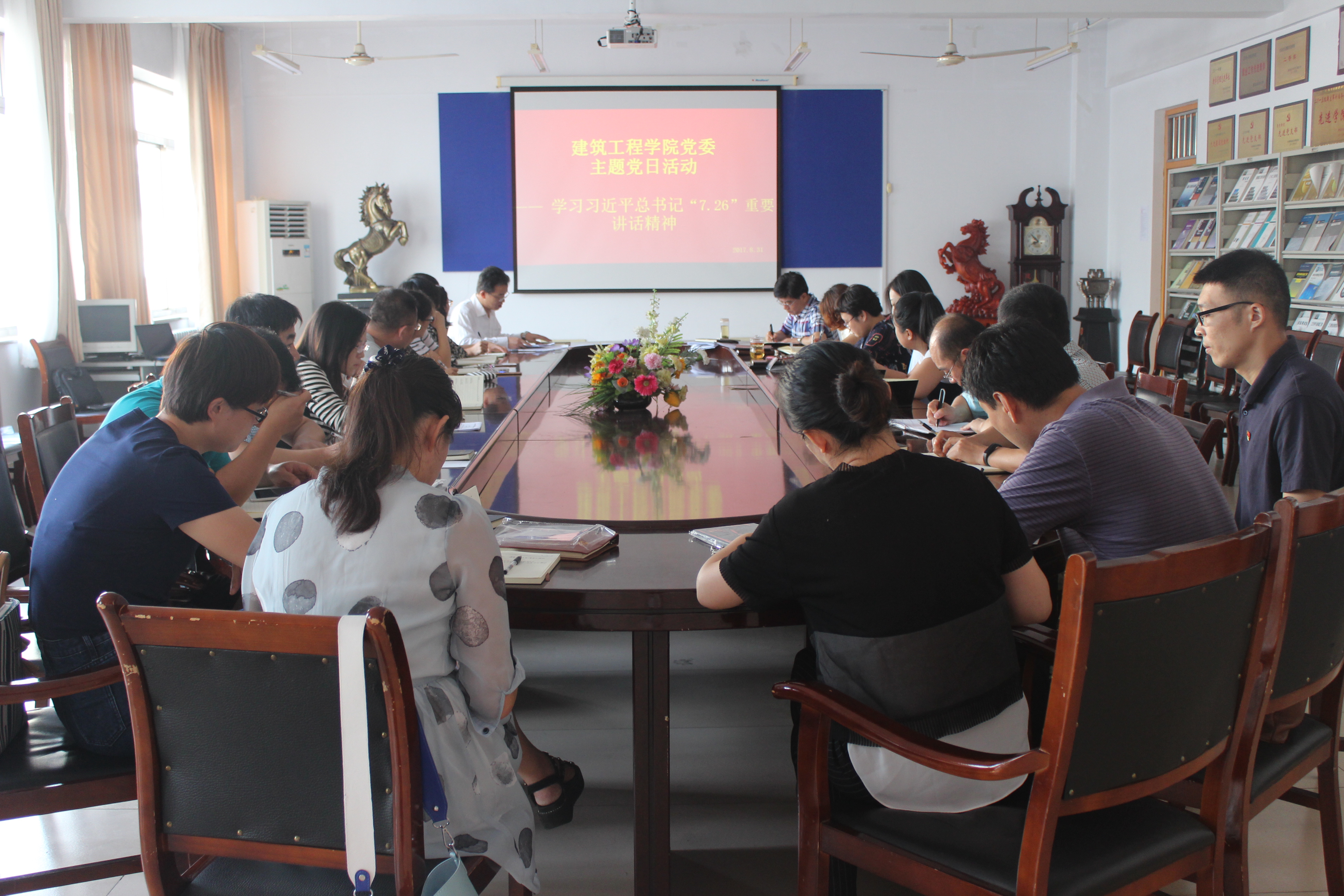 8月31日,建筑工程学院党委开展主题党日活动,组织学习贯彻习近平总书记“7.26”重要讲话精神,全体教工党员参加,党委书记田义轲主持会议。