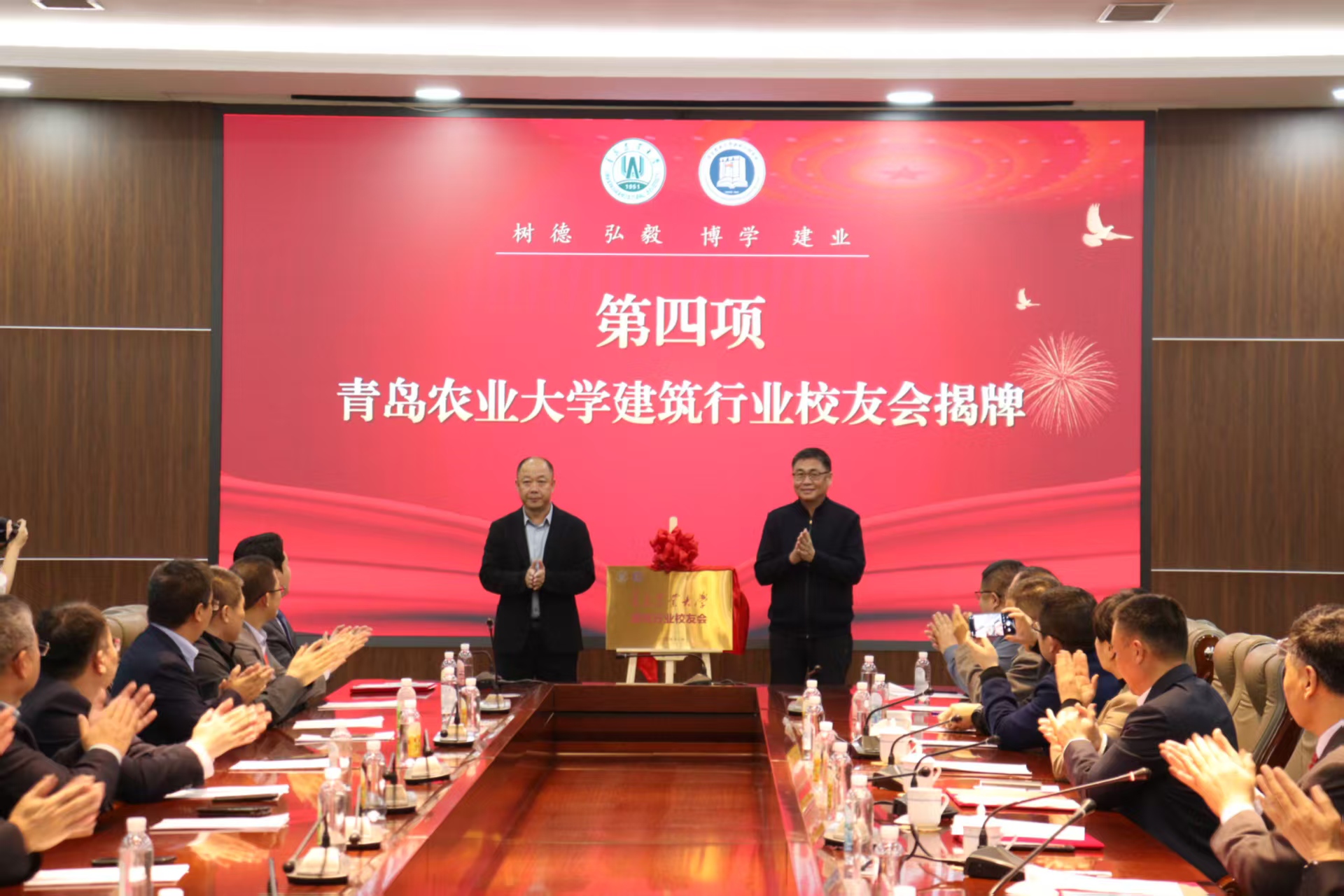 接下来,建筑行业校友会筹备组组长邵飞介绍校友会筹备情况。校友代表姜永亮发言,他指出行业正从“建造”迈向“智造”,并阐述了以“五好”标准建设“好房子”的发展方向,呼吁共同推动行业迈向高质量未来。随后,由青岛农业大学党委委员、副校长隋国武和03级校友王淳共同为建筑行业校友会揭牌,标志着学校与建筑领域校友的联系迈入新阶段。